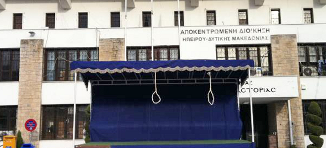 Στην Καστοριά ετοιμάζονται να τιμήσουν αύριο την επέτειο της απελευθέρωσή της πόλης, σήμερα όμως οι δημοτικοί υπάλληλοι και οι κάτοικοι είδαν κρεμάλες μπροστά από την εξέδρα των επισήμων.